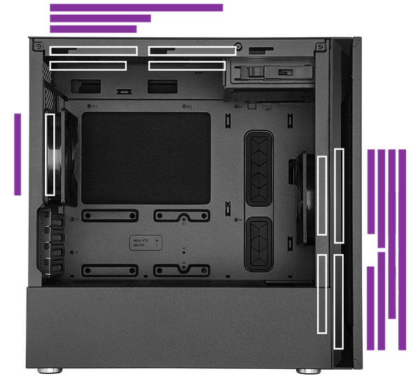 Available with seamless tempered glass or a sound-dampened steel side panel, systems can be built for show or for stealth with the Silencio.