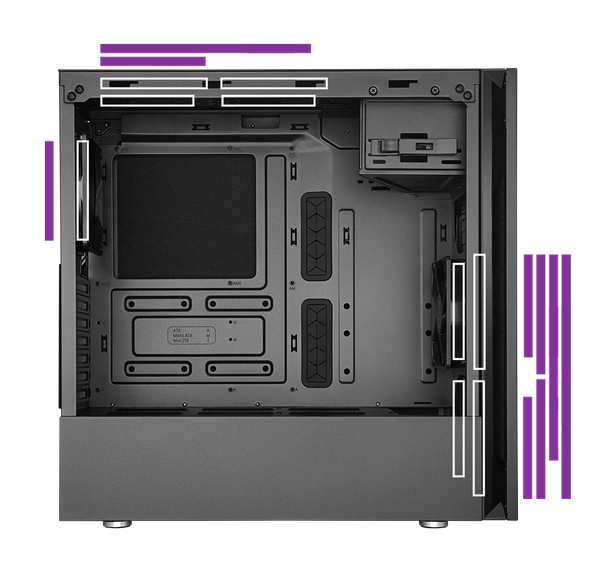 Fan Radiators Top: 120 / 140mm x 2 Fans 120 / 240mm* Radiator *remove ODD cage 35mm max motherboard component height Front: 120 / 140mm x 2 Fans 120 / 140 / 240 / 280 Radiator Rear: 120 x 1 Fan 120 x 1 Radiator