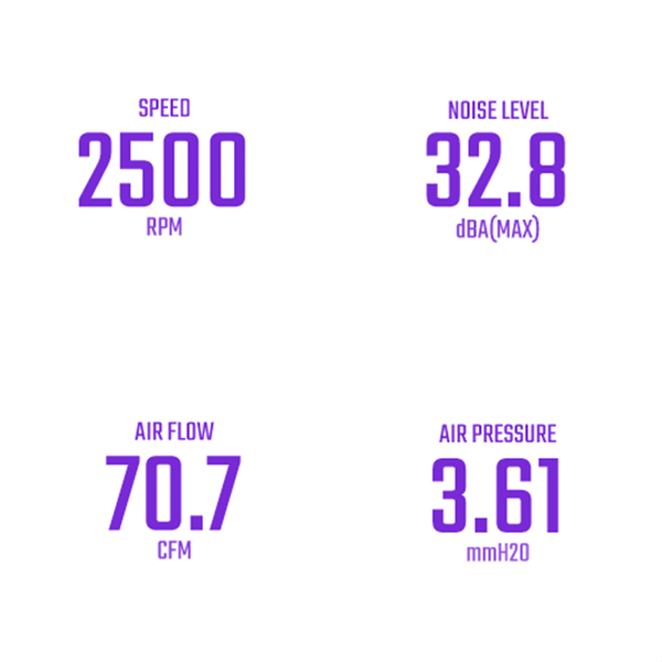 An improved fan blade provides higher fan speed, air pressure, and airflow while sticking to the same low noise level the SickleFlow is known for.